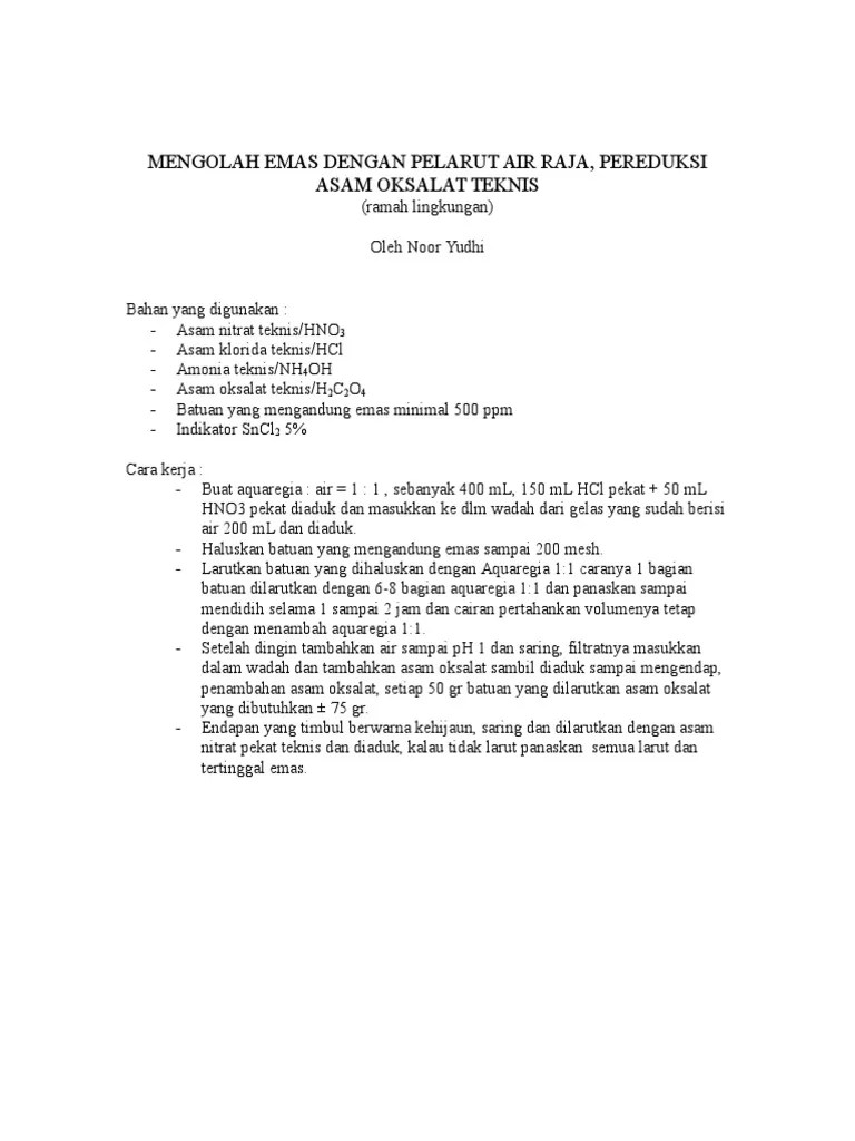 Karbon di hilangkan dari kandungan lain dengan asam (3 / 5 %), selama (t =30/45m), . Biarkan larutan semalaman dan semua . Tembaga akan terlarut dalam larutan asam nitrat dan meninggalkan endapan emas. Karena merkuri dapat berasosiasi dengan bijih emas 1. Sabtu, 14 januari 2012 cara mengambil emas dari barang elektronik barang. Tujuan percobaan adalah untuk memperoleh pola kencenderungan (trend) pengaruh dari penambahan hidrogen peroksida (h2o2) terhadap perolehan emas . Bahan kimia ini didalam kimia organik untuk menggantikan suatu atom hidrogen oleh gugus . Berikut cara kerja pengolahan emas dengan sianida : Melalui proses destruksi dengan menggunakan asam sulfat dan pengendapan menggunakan amonium hidroksida. Dia menyesalkan kurangnya peraturan dan regulasi pembelian bahan kimia di . Perak tak larut dalam asam klorida, asam sulfat encer (1 m) atau asam nitrat . Asam sulfat (h2so4), dan asam nitrat (hno3), serta penambahan larutan kalium iodida (ki) dalam. Siklus sulfur iodin sekarang ini sedang diamati sebagai cara yang praktis untuk .